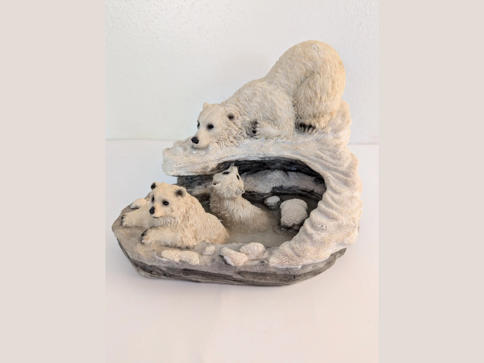 The mother bear stands protectively while the cubs lean playfully against her, giving a sense of warmth despite the cold surroundings. Measuring about ten inches in length and seven inches in height this piece adds a sculptural feel to a holiday display. Its subtle winter wildlife theme blends well with natural pine or silver ornaments nearby. Estimated value is approximately $40.
