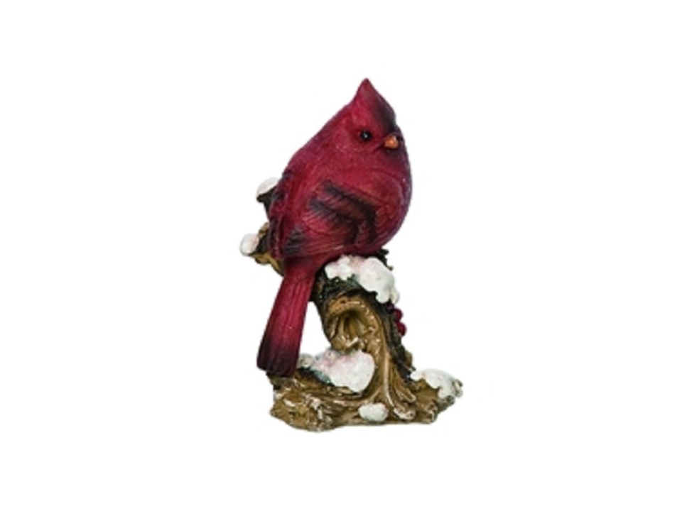 A bright red cardinal sits perched on a snowy branch with holly leaves and red berries. The contrast between red bird and white snow creates a striking visual. The glossy finish on the bird feathers catches light softly adding life to the piece. This figurine stands around six inches tall and is compact enough to tuck among evergreen garlands.