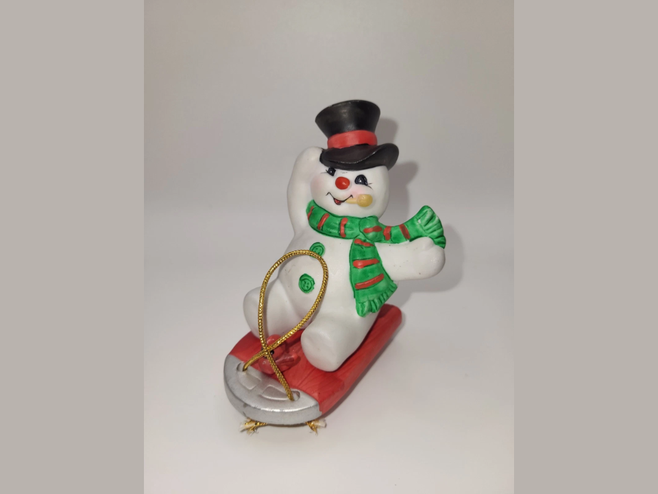 A small ceramic snowman sits on a wooden sled wearing a red scarf and a top hat. Its cheerful face and rosy cheeks offer a warm sense of holiday cheer. Frosty snow texture on the sled and snowman body adds realistic detail to the scene. This piece measures about six inches in height making it a good fit for a mantel or tabletop display.