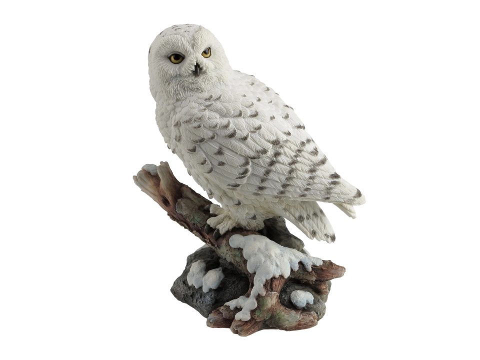 This piece shows a snowy owl perched upon a frosted pine branch with pinecone details beneath its talons. The owl has bright eyes and white feathers with light grey markings which gives it a realistic winter bird appearance. The pine branch sweeps gently making the figure feel dynamic despite being still.