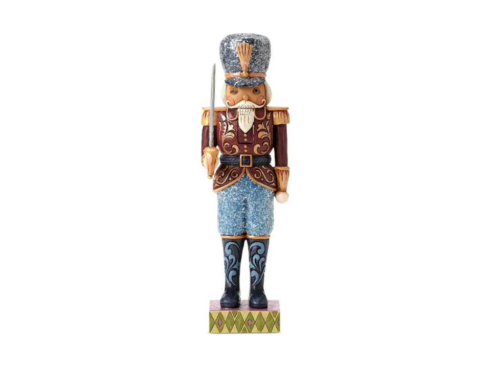 Standing about 12 inches high it draws the eye when placed near a fireplace or beneath a Christmas tree. The decorative sword at its side and ornate base make it feel regal. Many collectors arrange pairs of these nutcrackers for symmetry on a mantel. Estimated market value is around $40.