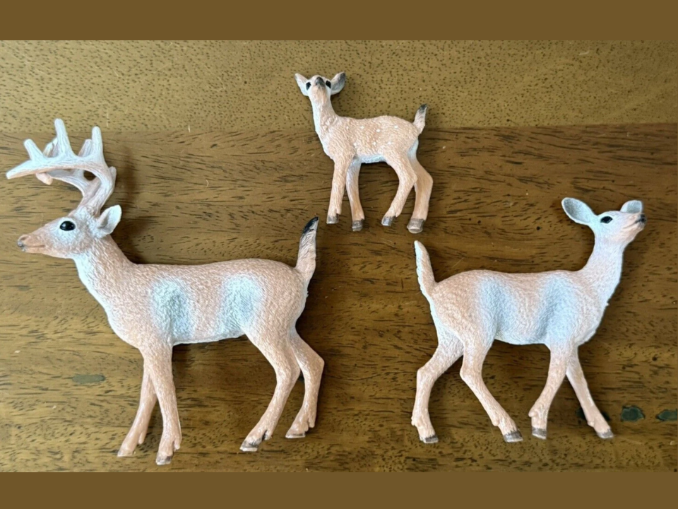 A small family of deer carved from resin shows a doe and two fawns resting in bed of faux snow. Their gentle expressions and soft coloring reflect the calm of a quiet winter forest. The texture on their fur and the slight dusting of snow at their hooves creates a sense of realism. The largest deer stands about eight inches tall while the fawns are around five inches.