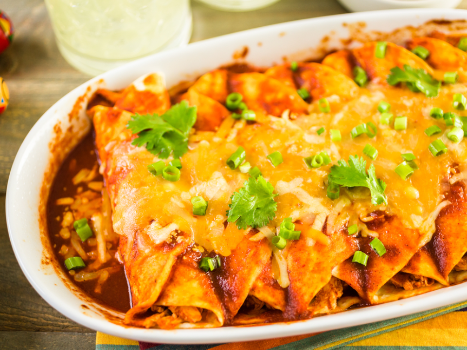 Chicken enchiladas are easy to prepare in advance and feel festive on the table. Ten flour tortillas filled with two cups shredded cooked chicken and enchilada sauce roll neatly for freezing. A generous topping of sauce and cheese helps keep everything moist during reheating. Baking at 375°F for 30 minutes melts the cheese and warms the filling evenly. Cooling fully before freezing helps the tortillas hold their shape.