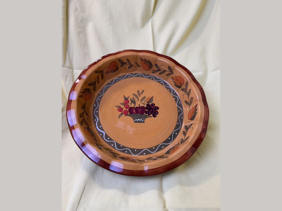 This pie plate features a warm color palette with illustrations of pumpkins, corn and autumn leaves around the outer rim. It has enough depth and width to bake or serve pies typical for Thanksgiving or fall dinners. Many cooks appreciate this plate for both functionality and seasonal charm. A clean plate in good shape usually sells for about $40 to $55.