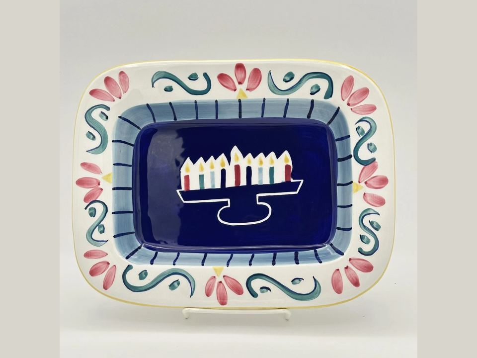 A serving dish decorated with a menorah between stylized blue and white stars presents a respectful nod to Jewish winter holiday traditions. Its size handles latkes or side dishes during a holiday feast. The simple yet meaningful design appeals to those who value cultural or religious connections. A dish like this usually sells for $28 to $45 when in good shape.