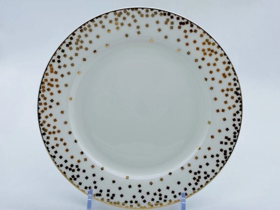 A small salad plate scattered with gold flecks or confetti against a white background delivers celebratory energy without overwhelming other dinnerware pieces. It suits salads or light first‑course dishes served during holiday parties or New Year dinners. Because of its lightweight design many people keep a few extras on hand for gatherings with guests.