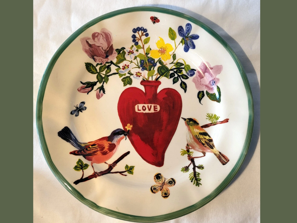 A small dessert plate painted with red hearts and tiny floral accents brings a gentle touch to romantic dinners. The plate’s simple shape combined with warm hues creates a pleasant intimate atmosphere. Many couples reserve such plates for sweet treats on special evenings or anniversaries.
