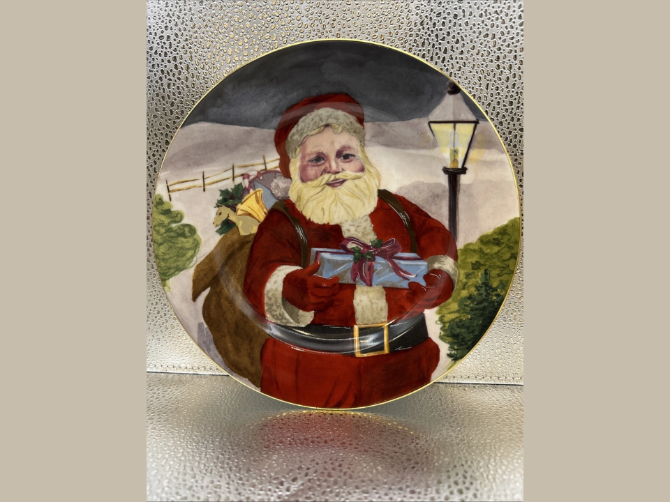 This cheerful salad plate shows a friendly Santa face with rosy cheeks and a bright red hat trimmed in white. The background often remains a soft pastel hue that keeps the piece from feeling overly kitschy.