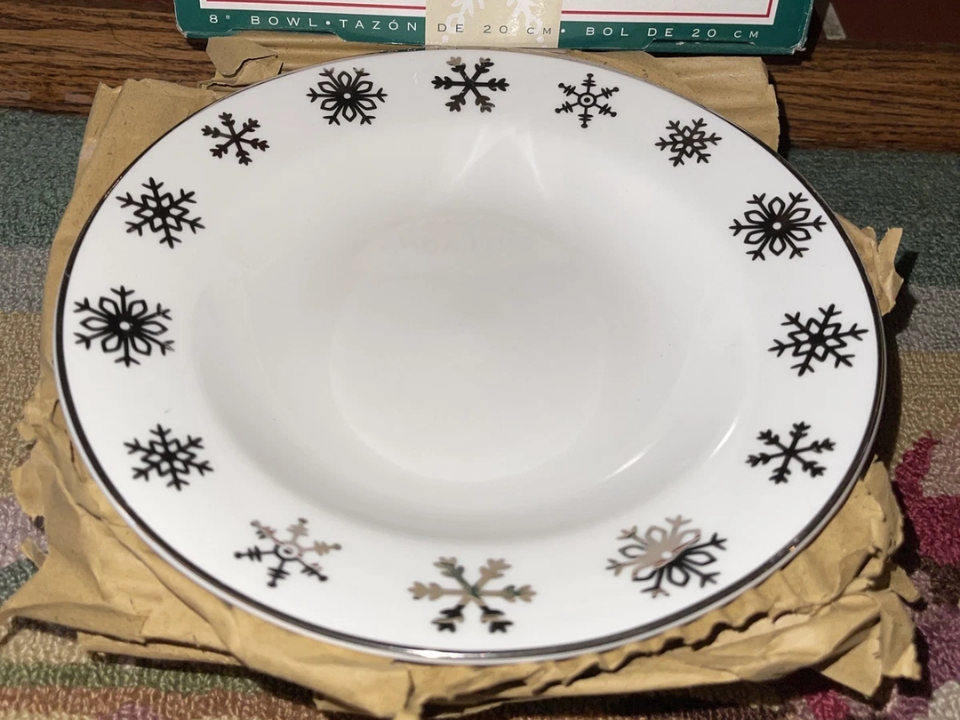 A single bowl at present might fetch around $25 to $40. Sets of four sometimes sell for about $90 depending on condition and brand. Because of its winter motif many owners bring it out once or twice a year which helps it remain largely unscathed. It can offer a gentle seasonal accent without overwhelming the rest of the tableware.
