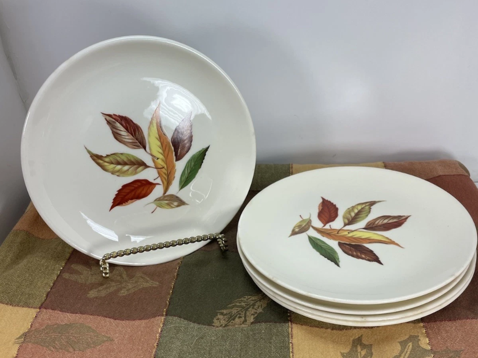 Small bread plates featuring a swirl of autumn leaves in amber, rust and gold evoke the harvest season. Their modest size makes them easy to stack or tuck away when not in use. Many designers choose a slightly irregular shape to mimic a fallen leaf adding rustic charm. On secondhand markets a single piece may sell for $15 to $25.
