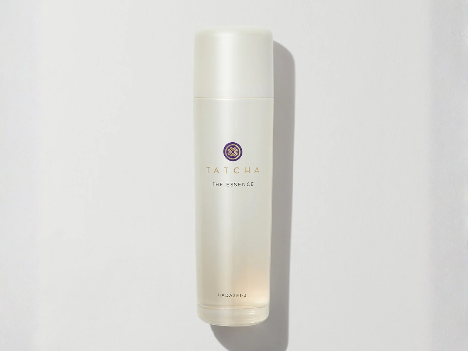 Tatcha The Essence acts as a light hydration booster that sits between toner and serum. It supports moisturizer because it helps other products spread and absorb more evenly, creating a smoother surface for creams. The key feature is the Hadasei 3 complex, a blend of fermented rice, green tea, and algae that targets hydration and texture. The liquid feels like water but clings softly to the skin, giving a slightly bouncy finish.