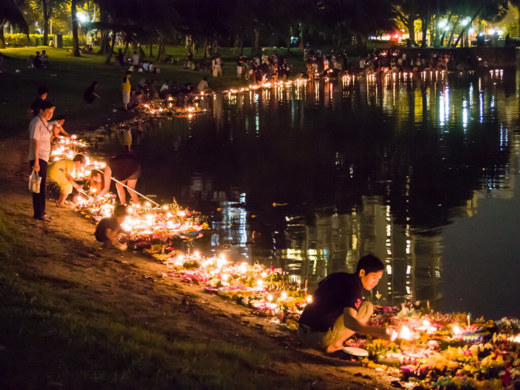 Held in November, Loi Krathong coincides with the rice harvest and the end of the rainy season. People float decorated baskets, called krathongs, on rivers and lakes to give thanks to the water. Candles, flowers, and incense make the waterways shimmer at night.