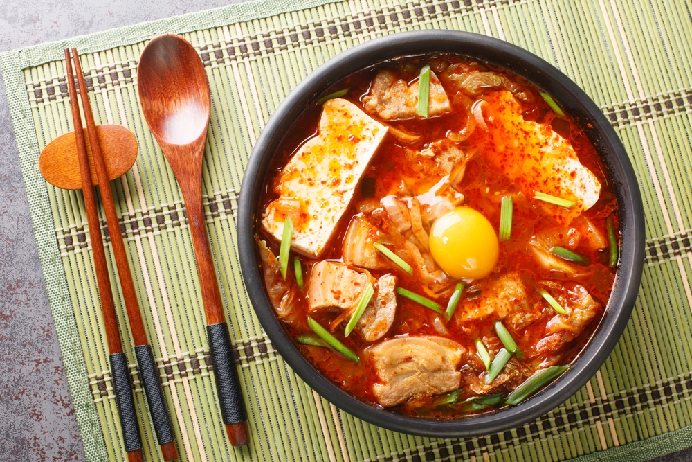 Kimchi Jjigae is a comforting Korean stew made from fermented kimchi, tofu, pork, and vegetables. This hearty dish is a staple in Korean households and is often served with a bowl of rice. The fermentation of the kimchi adds a sour and spicy depth of flavor to the broth, making it a rich and satisfying meal. It’s a great way to use up older kimchi that may have become too sour for eating on its own.