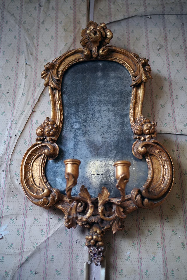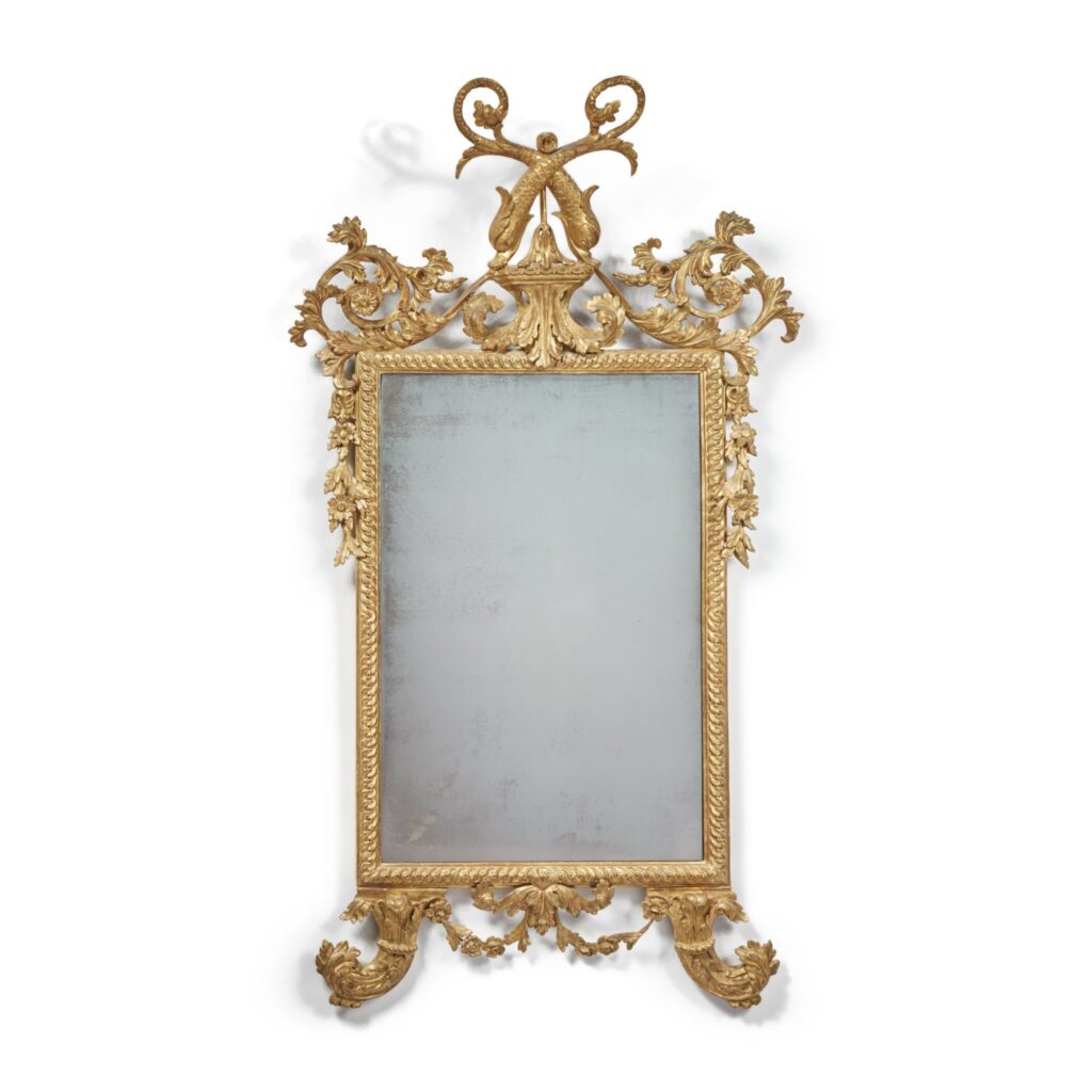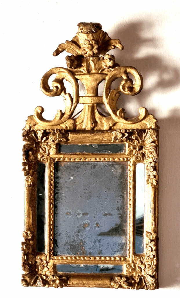 Girandole forms include candle branches attached to the frame. Lombardy produced elegant examples with rams heads or urns above a circular plate. The combination turns a mirror into lighting for festive evenings. Mercury silvering enhances the sparkle of candle flames. Typical values run from $5,000 to $13,000.