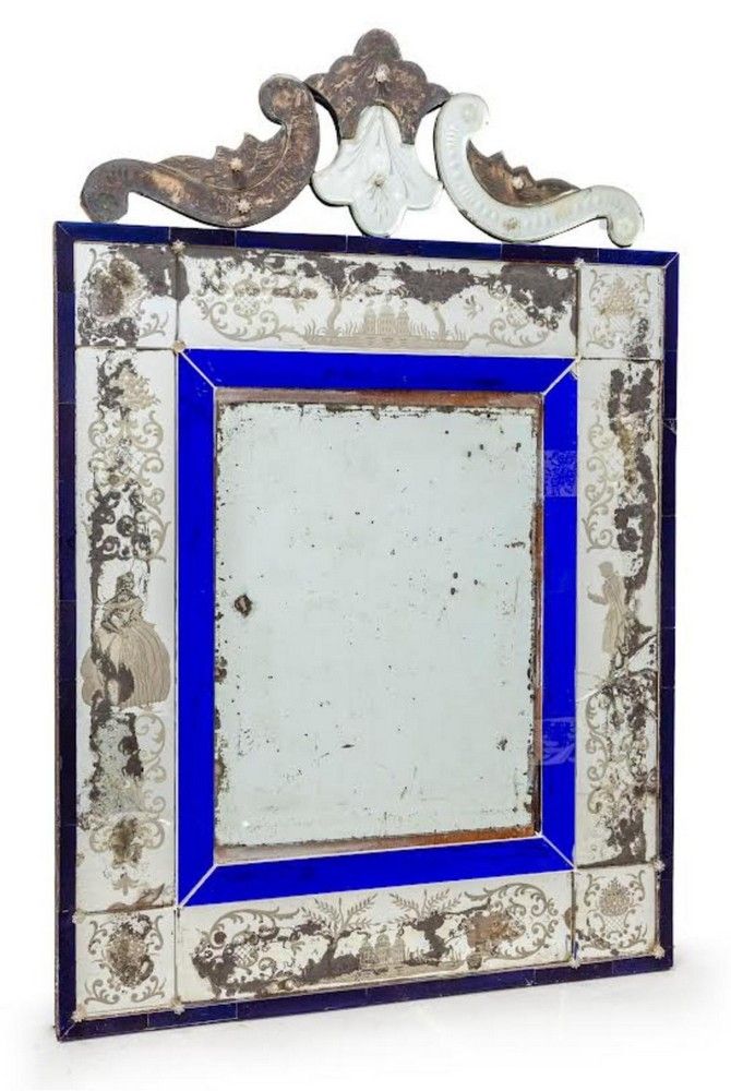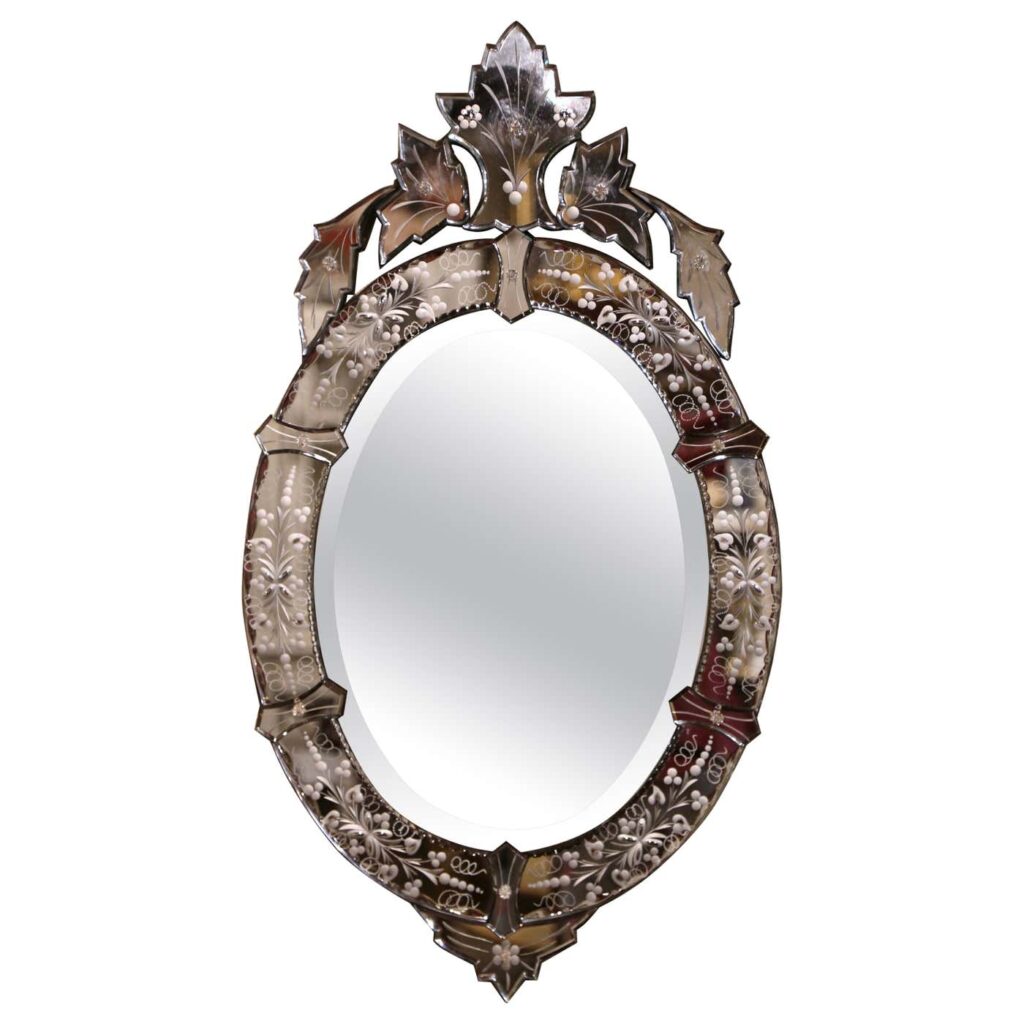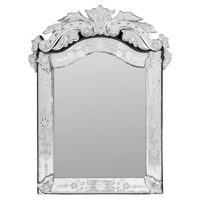 Around the turn of the century, Venetian makers revived classic etched ovals. This mirror carries a floral crest and scalloped border pieces. Bevels add sparkle while etched vines soften the outline. The look complements bedrooms and dressing areas very well. Market value often falls between $2,000 and $5,000.