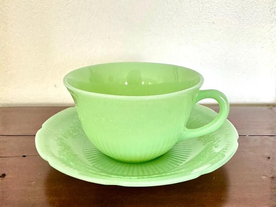 Anchor Hocking brought out Fire King Alice in 1945, and the cup and saucer remain popular because the floral edge gives jadeite a softer look. Buyers keep collecting this set because it adds pattern to shelves filled with smooth green glass. It also works nicely in tea displays and spring tables. A cup and saucer set often falls around $25 to $36 in the current market, though stronger examples can go higher.
