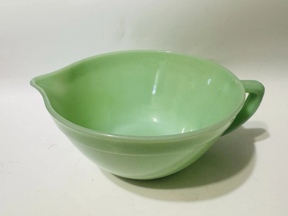 Anchor Hocking made Fire King batter bowls in the 1950s, and people still collect them because the handle and pouring spout make the piece feel very useful. The bowl also shows off jadeite well because the shape is broad and easy to notice. Many buyers like items that feel tied to real kitchen work rather than only shelf display. A nice batter bowl often runs around $75 to $100, though some smaller or more worn ones can sit lower.