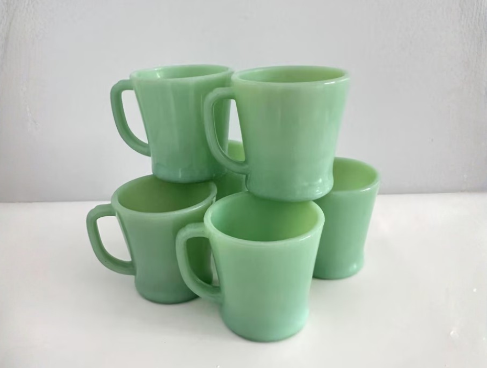 Anchor Hocking made the Fire King D handle mug in the late 1940s and 1950s, and it still ranks among the best-known jadeite mugs. People keep collecting it because the thick glass and simple shape feel very close to classic dinerware. It is a piece that works well for both daily use and open shelf display, and is priced $40 to $55 today.
