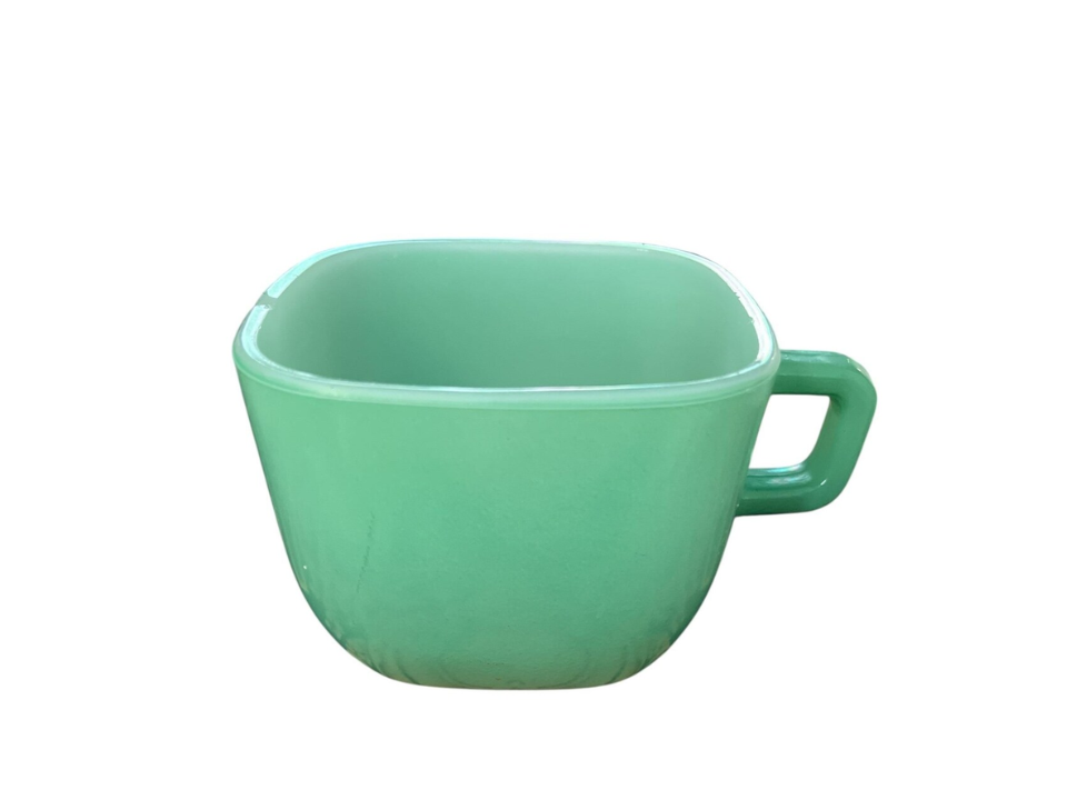 Glasbake made jade green mugs during the midcentury years, and the square mug still gets picked up because it looks different from the better-known Fire King shapes. The lines feel a little more modern, which helps the mug stand out in a mixed display. Buyers also like that it is usually easier on the wallet than some older mug styles. A square mug often sells around $15 to $25.