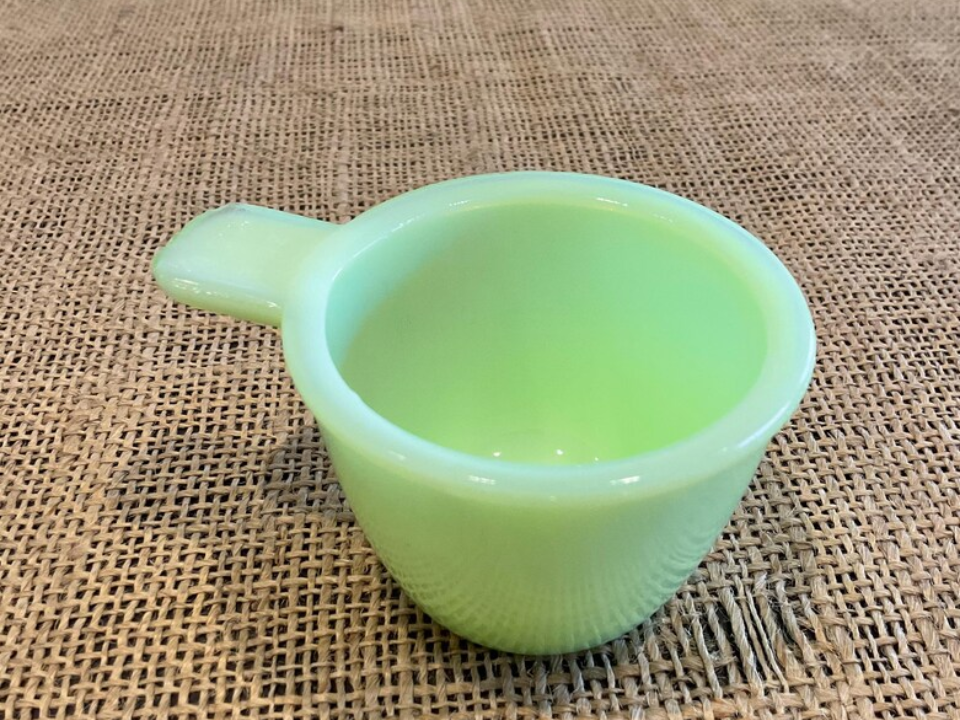 On a shelf, this piece brings a practical note that many collectors enjoy. Buyers usually check the handle, spout edge, and measuring marks before paying more. Since measuring cups are easy to understand and easy to display, they often appeal to both new buyers and longtime jadeite fans. That mix of function and old kitchen charm keeps them moving.