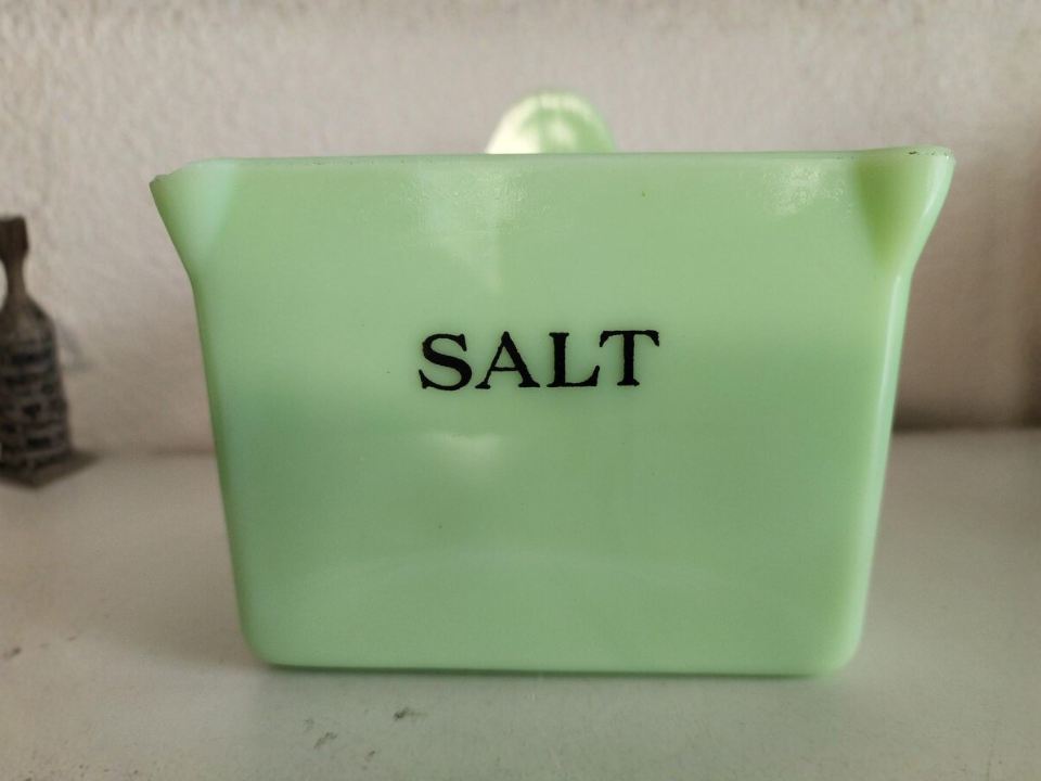 Jeannette Glass began making Jadite in 1932, and the salt box stands among the most talked about wall pieces from that early run. People keep buying it because it gives a kitchen shelf or wall a strong old-house feel right away. Its lift-top form, compact size, and soft green color make it easy to notice even in a crowded display. In the current market, a strong example is often priced around $1,350 to $2,000.