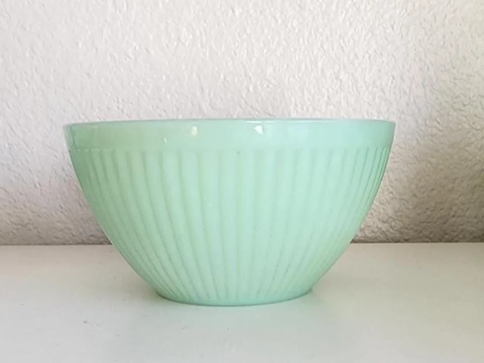 Jeannette made vertical ribbed mixing bowls during the 1930s, and people still like them because the rib lines give the glass more life. The texture catches light nicely and makes the bowl stand out from smoother jadeite pieces. Buyers often enjoy showing several sizes together because the nesting look feels full and balanced. A single bowl is often estimated around $86 to $140.