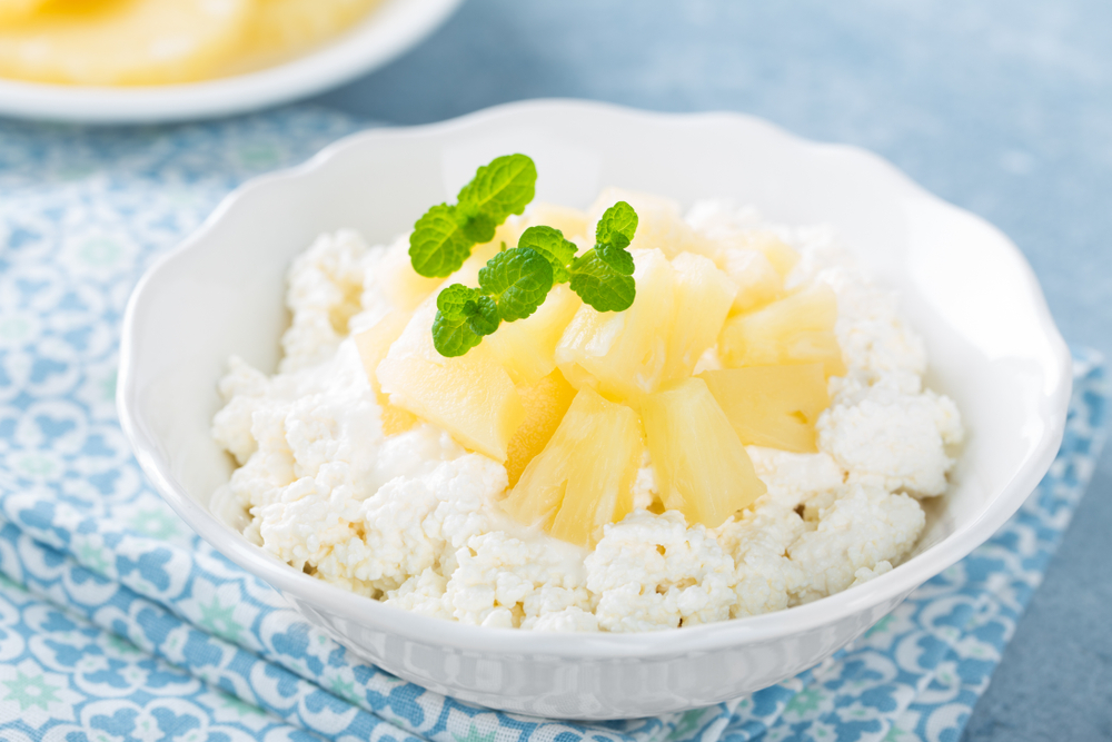 For this snack, you will need one-half cup of cottage cheese and one-fourth cup of fresh pineapple chunks. In a small bowl, combine the cottage cheese and pineapple chunks. Stir them together gently for a smooth, creamy texture. Enjoy immediately for a light and satisfying snack. You can also add a sprinkle of chia seeds or a handful of nuts for extra crunch, but the basic combination is perfect as is. This snack is a great option when you need a quick and easy treat.