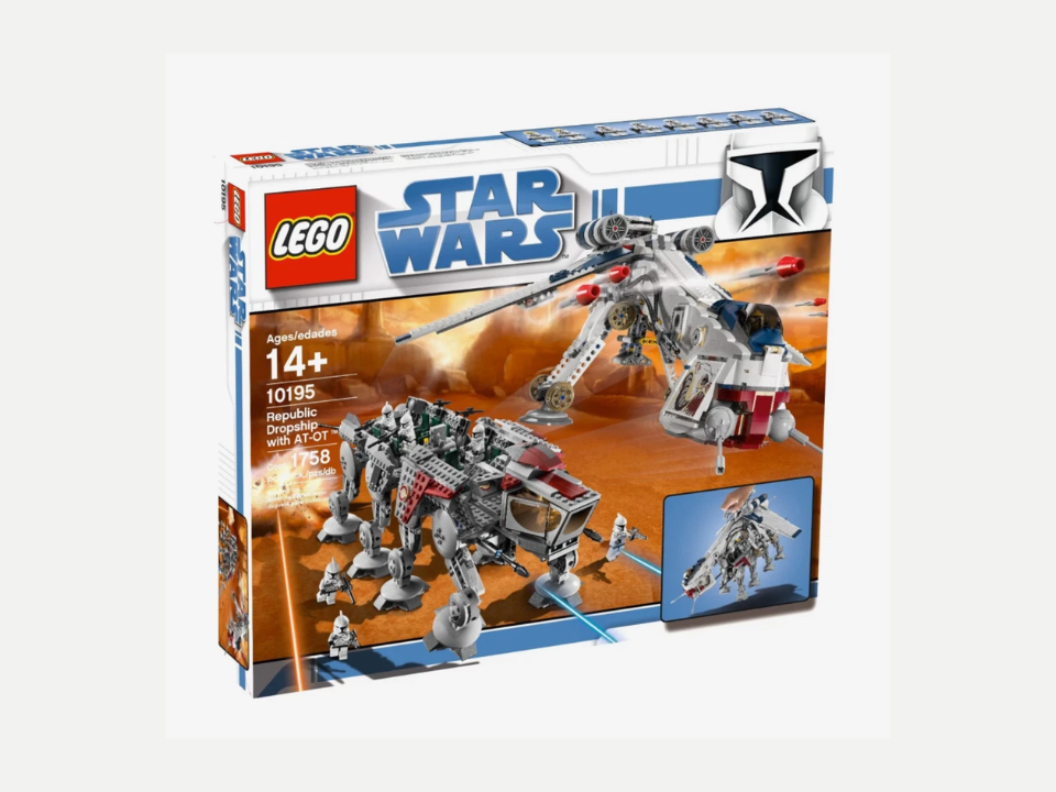 Republic Dropship with AT OT 10195 is a large Clone Wars set that combines a LAAT style gunship with a separate AT OT walker that can attach and detach in flight. The play feature of picking up the walker with the dropship handle made it a favorite with kids, and collectors now love that it offers two substantial vehicles in one package. The set includes a generous squad of clone troopers, pilots, and gunners, making it an army building pack as well as a display piece.
