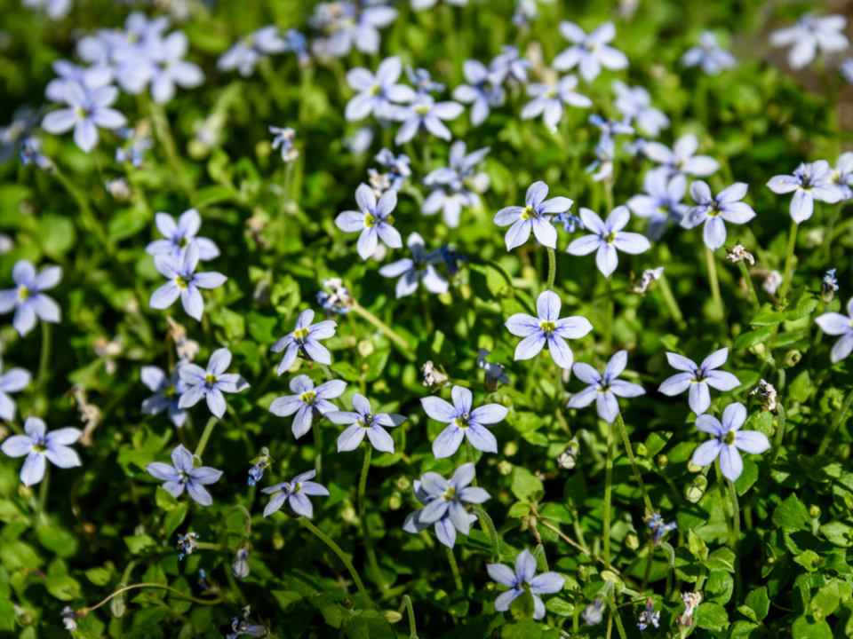 Blue star creeper is a very low plant that spreads into a soft green mat dotted with pale blue star shaped flowers. It stays close to the soil, which makes it useful between stepping stones and in front of borders. The tiny flowers show up in spring and can continue on and off when the weather stays pleasant. It does best in full sun to part shade and likes soil that stays lightly moist without turning muddy.