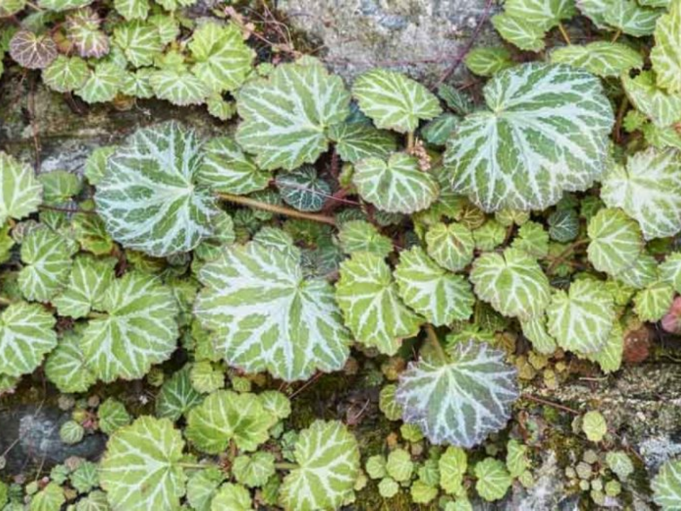 Strawberry begonia is a lovely ground cover that features round, dark green leaves with red veins. It stays low to the ground, forming a dense mat that works well for filling gaps or covering larger areas. The plant produces small white or pink flowers in spring, adding a soft touch of color. While it thrives in partial to full shade, it can also tolerate some direct sun if the soil is kept moist.