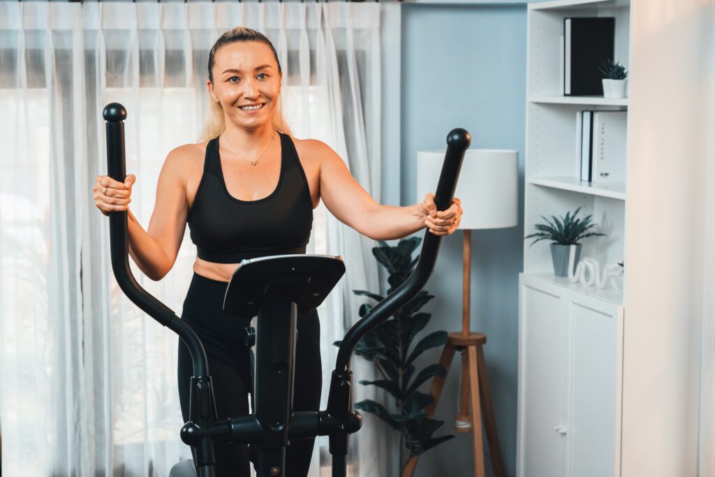 The elliptical gives you a flowing motion that can feel kinder than jogging. Your feet stay on the pedals, so there is no pounding on the joints. Keep the resistance and incline low so it stays comfortable for your knees. Lightly hold the handles or use the moving arms if that feels good for your shoulders.