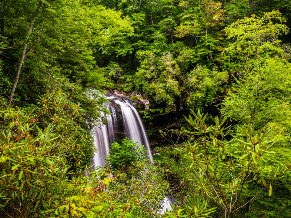 Dry Falls near Highlands, North Carolina, is a strong March choice when you want a dramatic waterfall without a demanding hike. This 75-foot waterfall sits in Cullasaja Gorge along Highway 64, has accessible overlook and a trail that goes right behind the water.