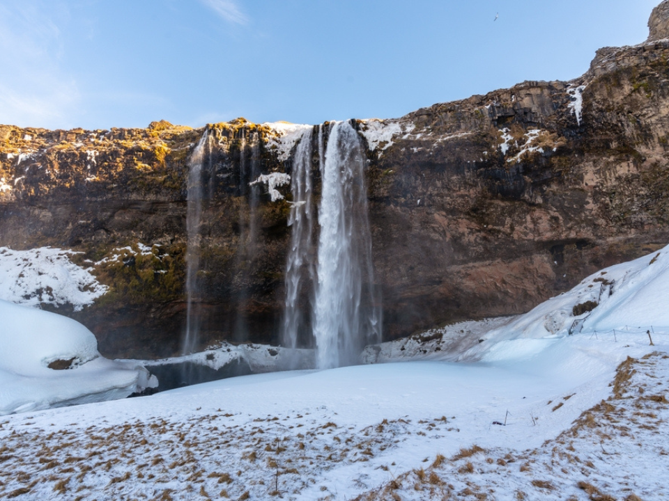 Seljalandsfoss near Hvolsvollur on Iceland’s South Coast is one of the easiest March waterfall trips to picture because the stop is right off the Ring Road and the waterfall itself is unusually interactive. The Seljalandsfoss is about 60 meters high and has a footpath behind the falls at the base of the cliff. That path changes the whole feel of the stop, since you are not just looking at the water from in front of it.
