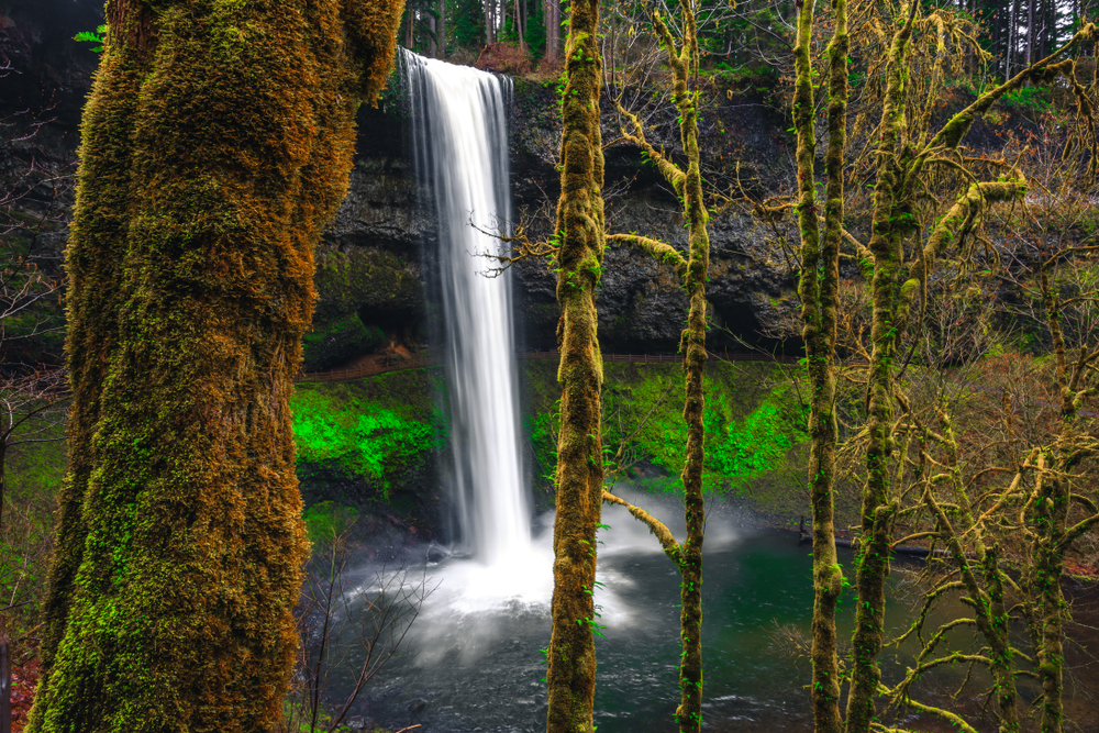 South Falls in Silver Falls State Park near Silverton gives you the kind of March outing where the walk itself feels soaked in water the whole way through. The Trail of Ten Falls is a 5-mile waterfall loop, and the park is known for a long string of major falls along Silver Creek. That means you are not traveling for one quick stop and then leaving. The star here is South Falls, where the path passes behind the curtain of water and turns the view into something almost theatrical.