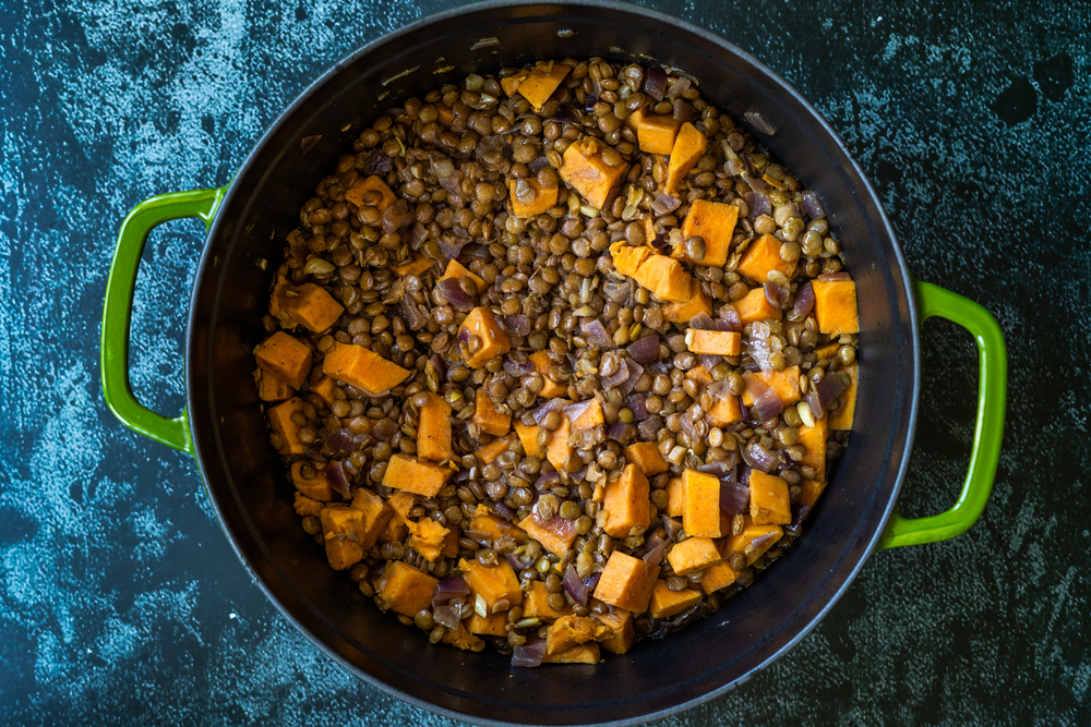 Rinse the lentils and cook them with vegetable broth. Add chopped onion, carrots, celery, and diced tomatoes, and bring to a boil. Simmer for 30 minutes, or until lentils are tender. Season with cumin, salt, and pepper. Store in airtight containers.