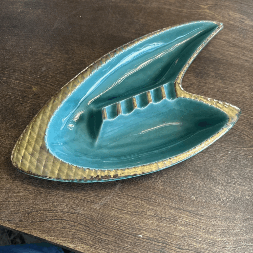 These ashtrays became popular in the 1960s when designers embraced unusual geometric and free-form shapes instead of conventional round forms. Their distinctive boomerang or abstract outline gives them that unmistakable mid-century vibe. Many are glazed in pastel or bold tones, sometimes with drip or speckled finishes. In recent online listings, similar ashtrays have sold for roughly $30 to $75 depending on condition. Their unique shape and the era they evoke make them attractive pieces for collectors looking for authentic mid-century style.