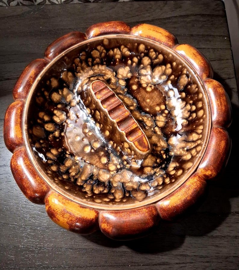 During the mid-century period, ceramic makers sometimes used a lava drip or drip glaze technique that produced unpredictable, organic drips and swirls in the finish. That glazing style combined with unusual shapes gives such ashtrays a very vintage appeal. Examples similar to those listed online can fetch around $35 to $70.