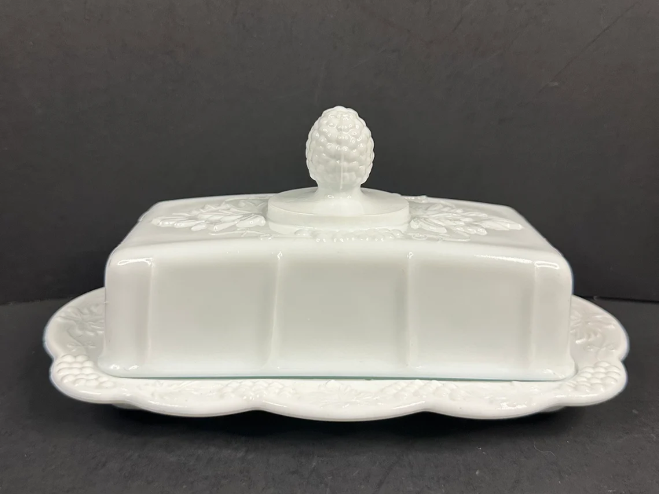 A covered butter dish may sound practical first, though this Colony piece has real spring table appeal. The Harvest pattern has grapes and leaves that give it a soft, decorative touch. This line is often dated from 1966 onward. A common value today is around $60 to $85.