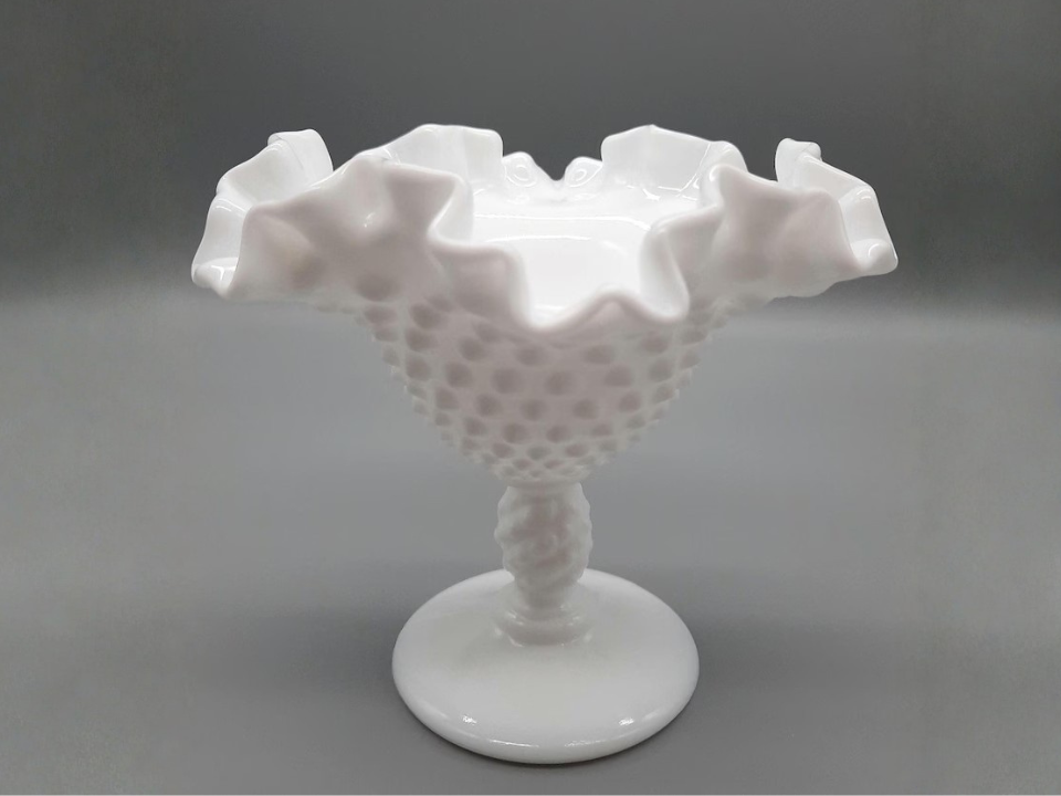 The round compote is another Fenton favorite that often leaves antique shelves quickly in spring. Its curved body and raised base give it a soft look that suits seasonal table settings. Most collector guides place this line starting in 1948. A fair market value today is usually about $18 to $28.