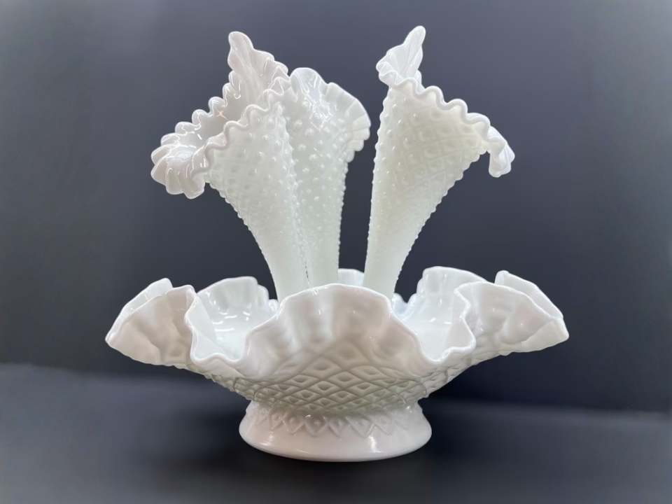 For collectors who want a true statement piece, the Fenton two-piece epergne set has strong appeal in spring. The bowl and vase shape was made for flowers, and the white glass keeps the whole look light and airy. This line is usually traced back to 1948. A complete set now often brings about $75 to $110.