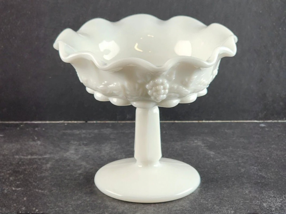 Westmoreland made grape pattern milk glass that still has a loyal following, and the footed lipped comport is a very good example. The paneled shape and raised grape clusters give it a rich vintage look, while the white glass keeps it easy on the eyes. This line is often dated from 1940 to 1984. A current value is often around $25 to $35.