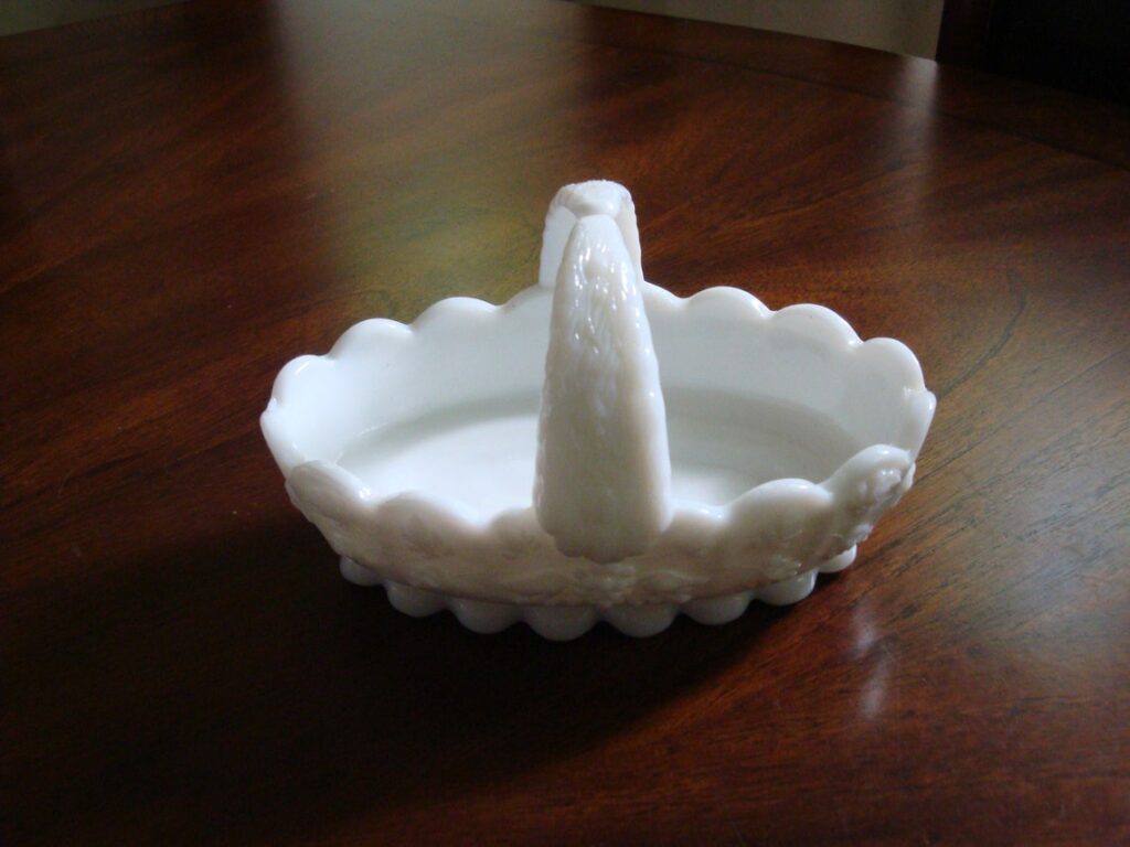 Handled baskets almost always do well in spring, and this Westmoreland basket shows why. The handle adds shape and charm, while the grape pattern gives the body a fuller vintage look. The line is usually dated from 1940 to 1984. A fair value today is often around $60 to $80.