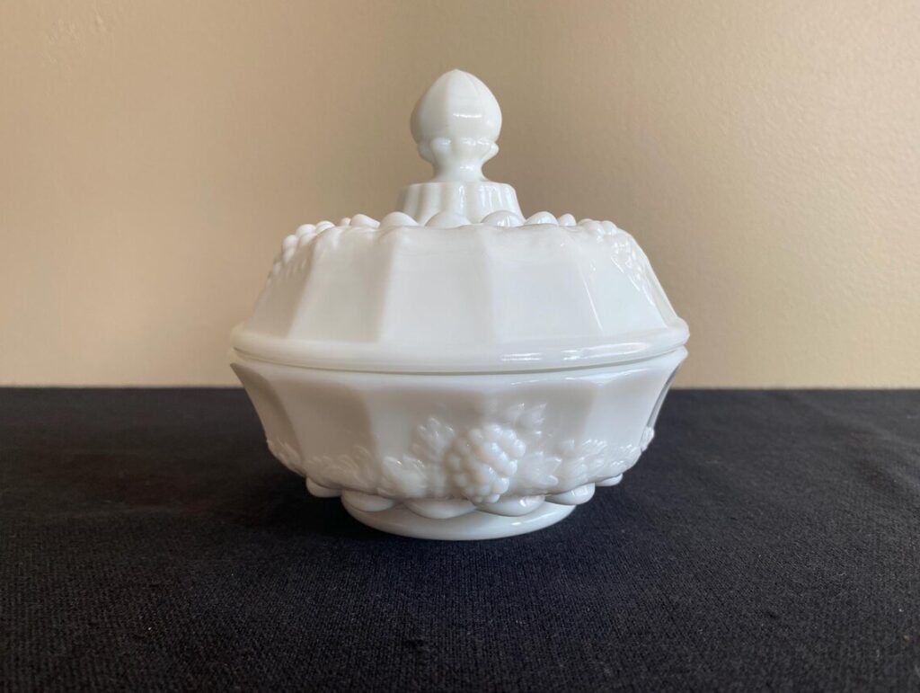 Small covered boxes sell well in spring, especially when they come from a known maker like Westmoreland. This puff box has the grape pattern that collectors like, and the lid gives it a finished look that matters a lot for value. Paneled Grape pieces are commonly dated from 1940 to 1984. Market value for a complete example is often about $25 to $35.