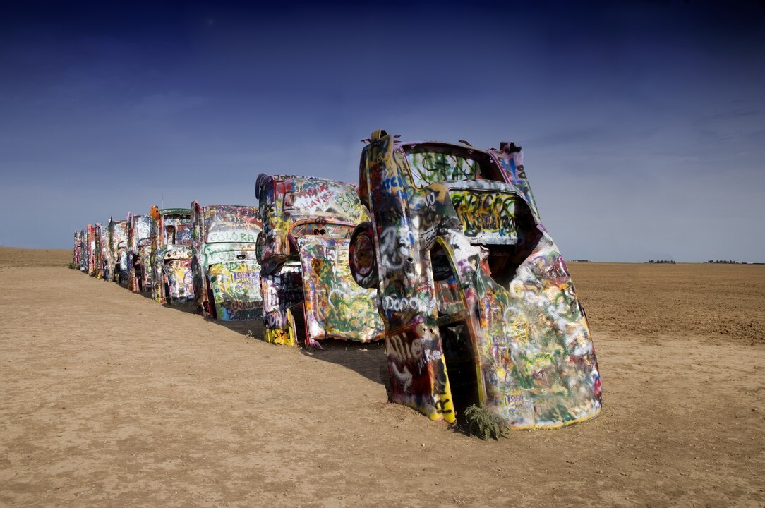 Located off Route 66 in Amarillo, Texas, Cadillac Ranch is a colorful and unique art installation that draws travelers from all over. The site features ten old Cadillacs, half-buried nose-first in the ground, and covered in layers of graffiti. It began in 1974 when a group of artists created the piece to symbolize the evolution of the American automobile. Over the years, it has become an iconic stop for those journeying along the historic Route 66.