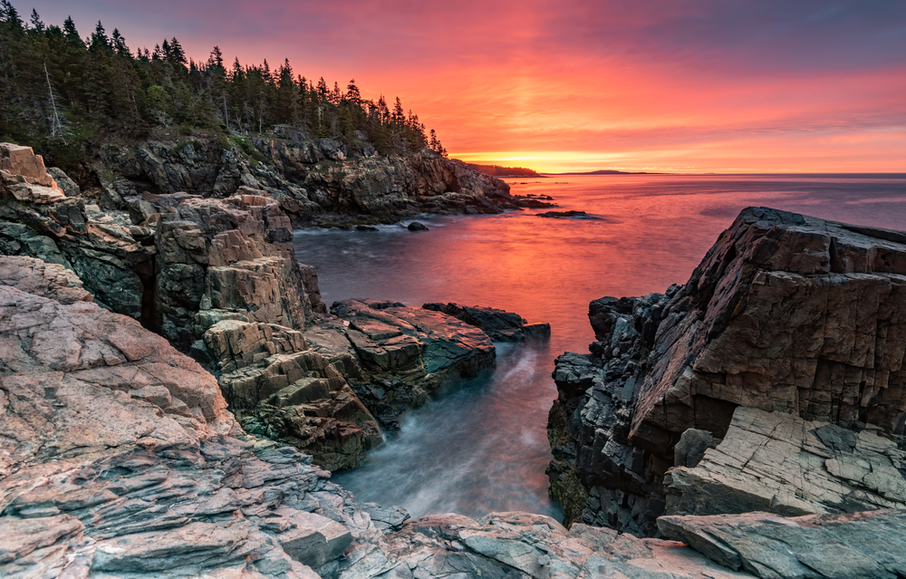 Cadillac Mountain often receives snow that creates gentle curves along its slopes. Birds move across the shoreline looking for food, leaving marks in the snow near beaches and tide pools. The landscape feels calm and bright, especially during sunrise when the winter light spreads slowly across the coast. December brings a gentle stillness to Acadia that many visitors appreciate.