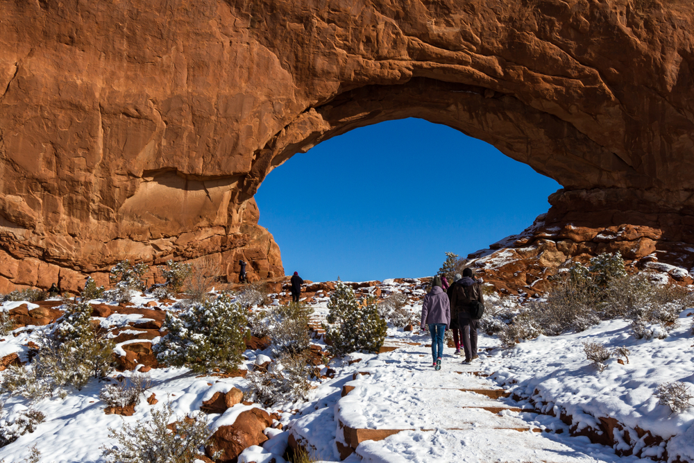 Arches National Park turns into a striking winter scene in December with snow outlining the curves of red rock arches. The bright white snow highlights the shapes of the formations more clearly than in warm seasons. The cooler air creates stillness across the desert floor, while the low sun brings soft shadows across the sandstone. Trails remain open and quiet, giving visitors long stretches of peaceful walking.