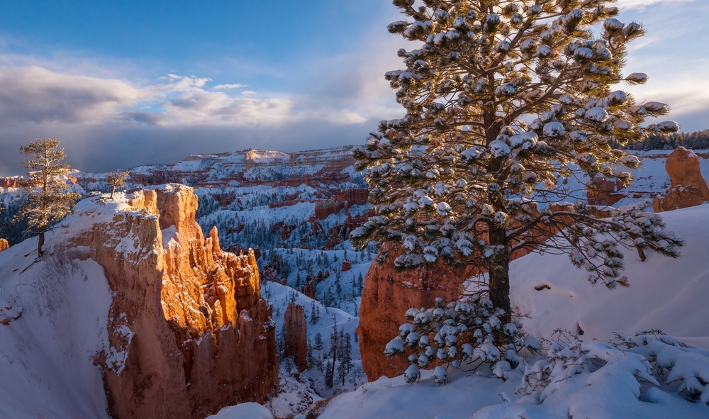Bryce Canyon turns magical in December when its red rock hoodoos receive a dusting of snow that highlights their shapes. The bright red and orange rocks look striking beside the white snow, creating a scene that feels almost like a painting. The air is crisp and clear, giving visitors wide views across the amphitheaters that stretch into the distance. The quieter winter pace helps people appreciate the tall rock formations in a more relaxed setting.