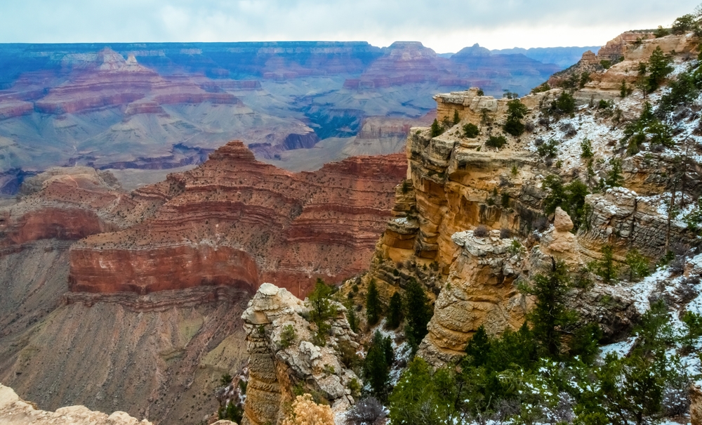 The Grand Canyon becomes particularly striking in December when snow lands on the upper rim. The white layer outlines the edges of the cliffs, creating a strong contrast with the deep colors inside the canyon. Cold air enhances the clarity of the views, giving visitors crisp scenes that stretch across the wide expanse. Trails near the viewpoints feel peaceful under the winter sky.