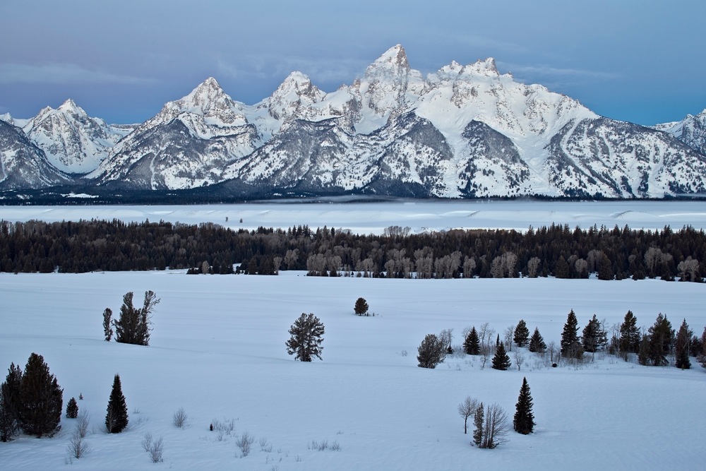 Grand Teton offers dramatic winter scenery in December, with its tall peaks coated in thick layers of snow that reflect the soft winter sunlight. The crisp air clears the sky, allowing the sharp shapes of the mountains to stand out in full view. Frozen lakes at the base of the peaks create mirror-like surfaces that add to the peaceful feel of the park. The pine trees hold fresh snow on their branches, giving the lower slopes a gentle and welcoming appearance.