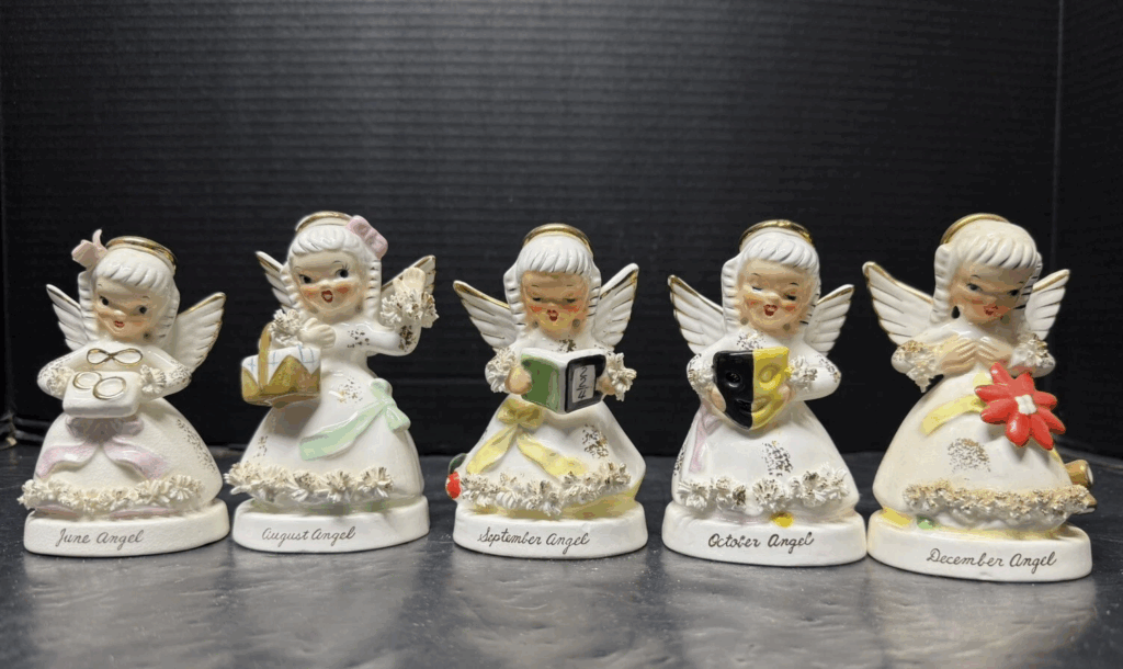 Napco’s Birthday Angel series appeared in the 1950s and became a cherished collectible line. Each angel held an item representing a month’s theme, such as flowers or hearts. The figures were made of porcelain and painted in gentle pastel tones. Their soft expressions and golden accents added to their charm. A full set can fetch several hundred dollars today.